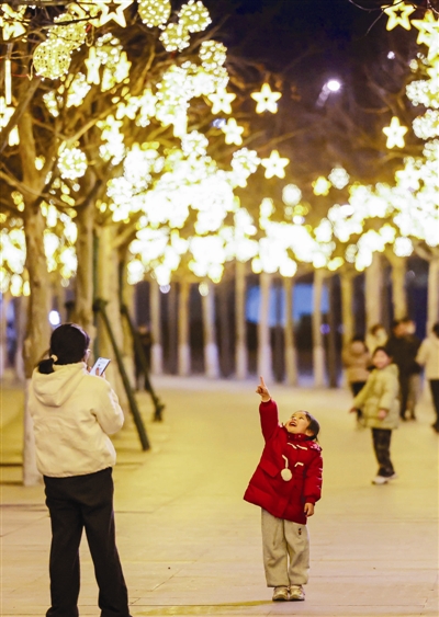 東麗區的燈光布置圍繞重點道路、核心點位進行,特別是中心城區與入市口主乾道,如津塘路、躍進路等四條主乾道,采用了懸掛國旗、中國結、燈籠,樹乾纏裹高亮度串燈的方式布置,夜晚降臨華燈初上,新春的氣息分外濃烈。在東麗廣場、棲霞路招遠路交口等重點點位,以及詹濱裡南北院綠地,可以見到“春”字造型燈、發光鹿、麥穗燈等特色燈飾,搭配LED串燈、流星雨燈。