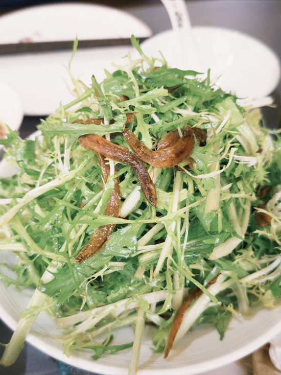 丁香魚乾拌苦菊則是解膩神器,新鮮苦菊去老根洗淨,撕成小段,搭配香脆的丁香魚乾,充分拌勻後,苦菊的清爽微苦與丁香魚乾的咸鮮香醇完美融合,醬汁酸甜適中。